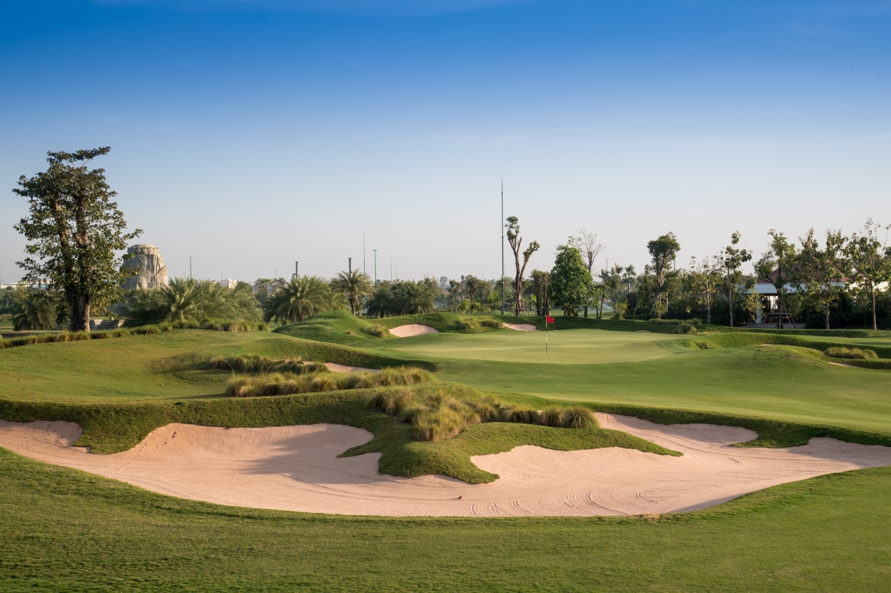 The par-72 East Course plays to over 7,400 yards and through scale models of pre-Angkorean structures including Preah Vihear Temple, Bayon Temple, and Angkor Wat. The design makes a unique combination of culture, leisure, and golf. Teeing areas provide for good views over the surrounding countryside and from the high points on the course. Vattanac is grassed with the latest Paspalum variety which ensures good golf conditions. Water comes into play on most holes, and the lack of elevation change is more than made up for in mounding, bunker complexes, and extensive landscaping.