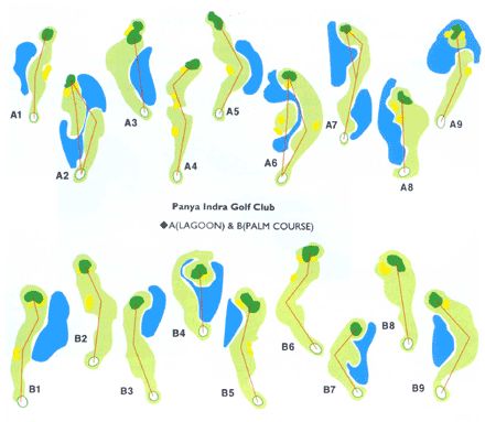 Whether you play the Lagoon course (A), Palm course (B) or Garden course (C) pleasantly contoured and testing holes wait. There is more water to negotiate on the Lagoon, although the Palm and Garden nines do not lag too far behind on that score. Panya Indra offers several unusual design features, in particular undulating fairways. The par-3 holes are perhaps the most testing aspect of this course and on four occasions the player has to hit his tee shot over water. The Palm course actually boasts an excellent island green par-3, its 4th hole. There are also some very testing dog-leg holes on each of the three nines as well.